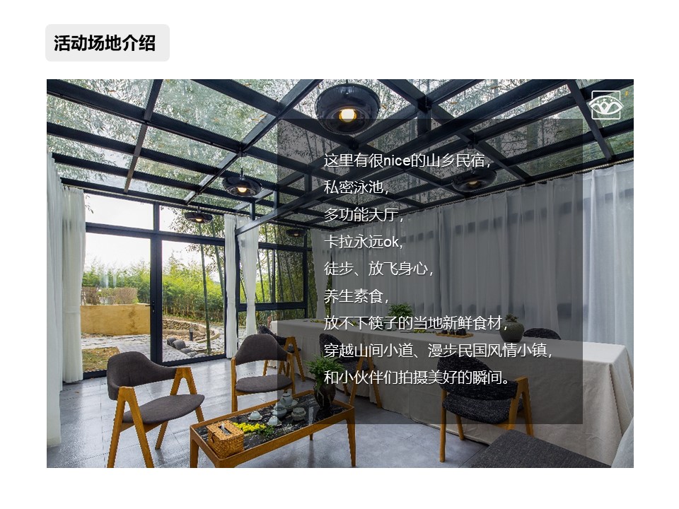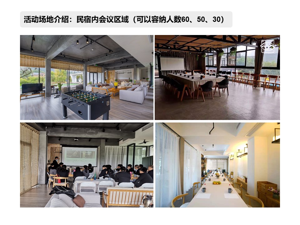 庭院內配套活動區域有:多功能大廳、大小會議區域3個(可以容納60人/50人/30人)、泳池、燒烤區、茶室、陽光餐廳、ktv、桌游、桌球、棋牌室、大草坪等.