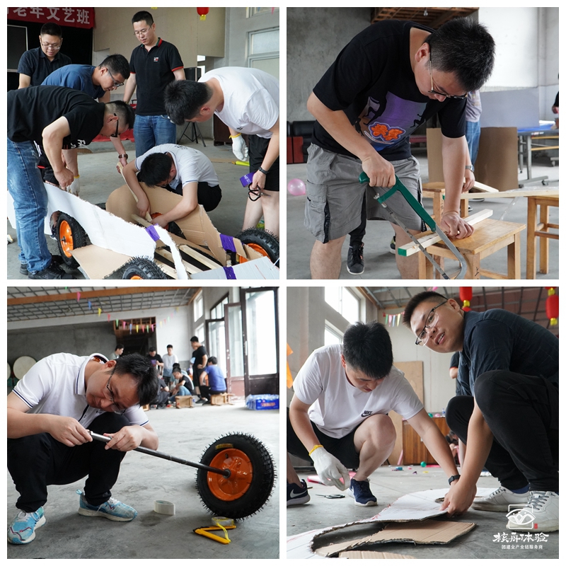 造車環節正式開始,在規定的時間內,要通過車輪、軸承、紙板、扎帶等基礎材料,構造出一輛既美觀又能載人的F1賽車。