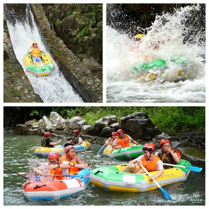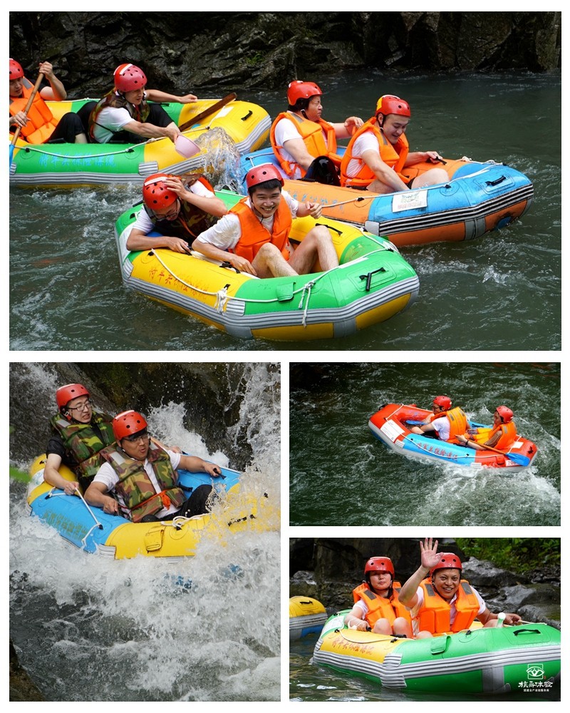 熱身過后,小伙伴們迅速帶好安全帽,穿上救生衣全副武裝,蓄勢待發……工作人員陸續將一艘艘漂流船放入水中,大家兩人一組,帶上船槳,馬上開始這段驚險刺激的漂流行程啦!隨著河道落差所產生的沖擊力,一艘艘小船飛馳而過,水花聲、尖叫聲此起彼伏……整個過程有驚無險,即使也會出現傾覆的情況,我們的小伙伴都能彼此照應,一同克服,重新將小船入水。