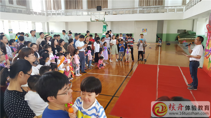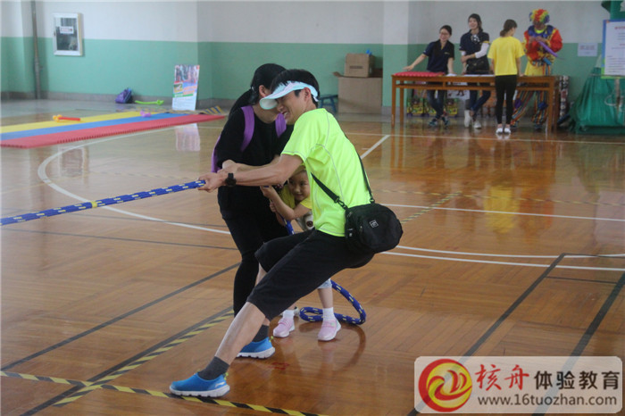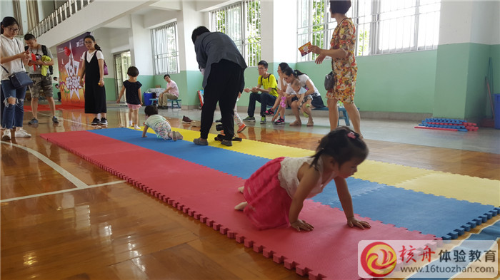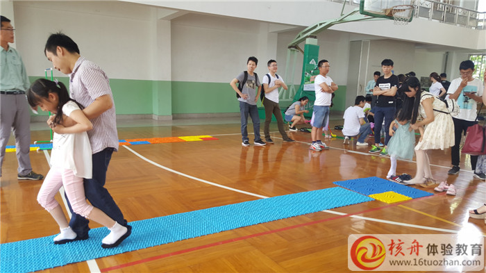 在體育館里,雖然室內溫度有點高,但是一點也不影響家長和孩子們玩耍的熱情,共同合作,指壓板挑戰,現場氣氛十分熱鬧。
