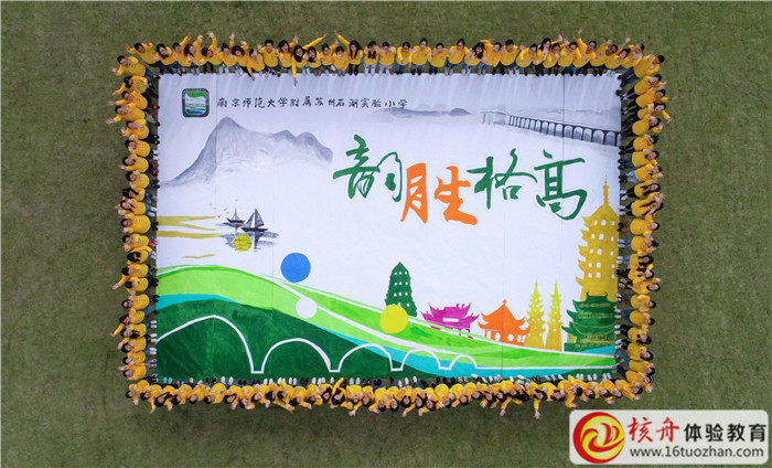 核舟拓展為石湖實驗小學量身定制的一款只屬于他們的藍圖,圖中有石湖大橋,有韻味十足的潑墨山水畫,有一座座地標建筑,更有校訓“韻勝格高”,通過大家有效的溝通,合理分工,調色,上色,拼接等工序,最終打造出一幅團隊巨畫。
