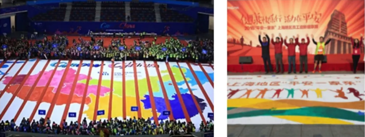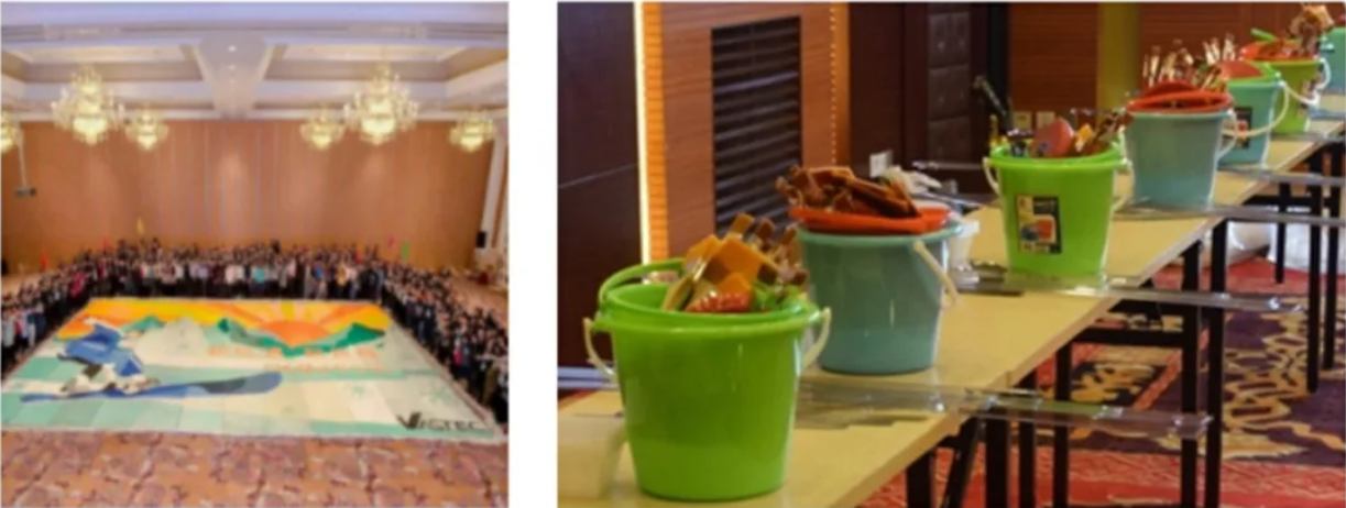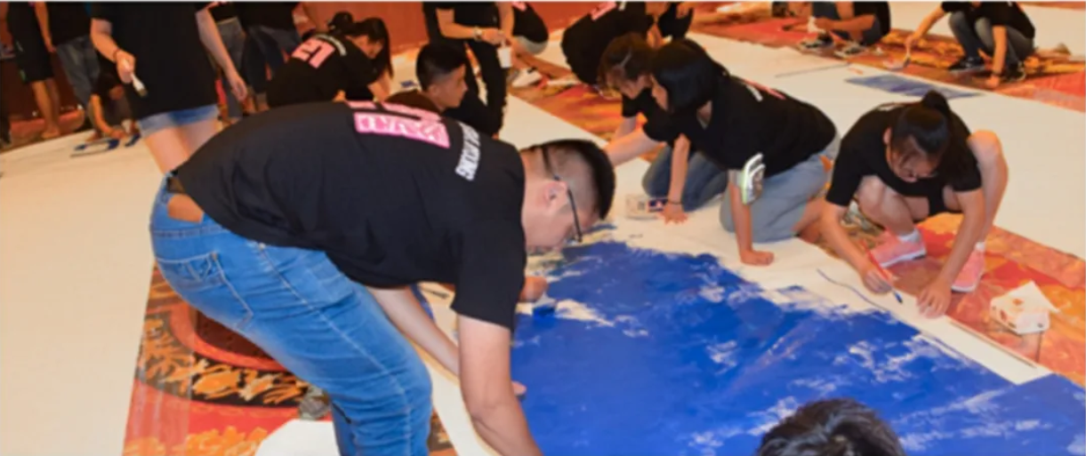 參與者用畫筆和顏料,揮灑藝術(shù)才能,繪出史詩(shī)般的巨幅畫作,巨幅畫作會(huì)被分成若干小塊,各部分由不同的團(tuán)隊(duì)負(fù)責(zé)完成。通過團(tuán)隊(duì)成員的共同努力創(chuàng)作,最后拼成一幅具有企業(yè)文化代表意義的圖畫,用視覺感觀直接呈現(xiàn)在所有人的面前。