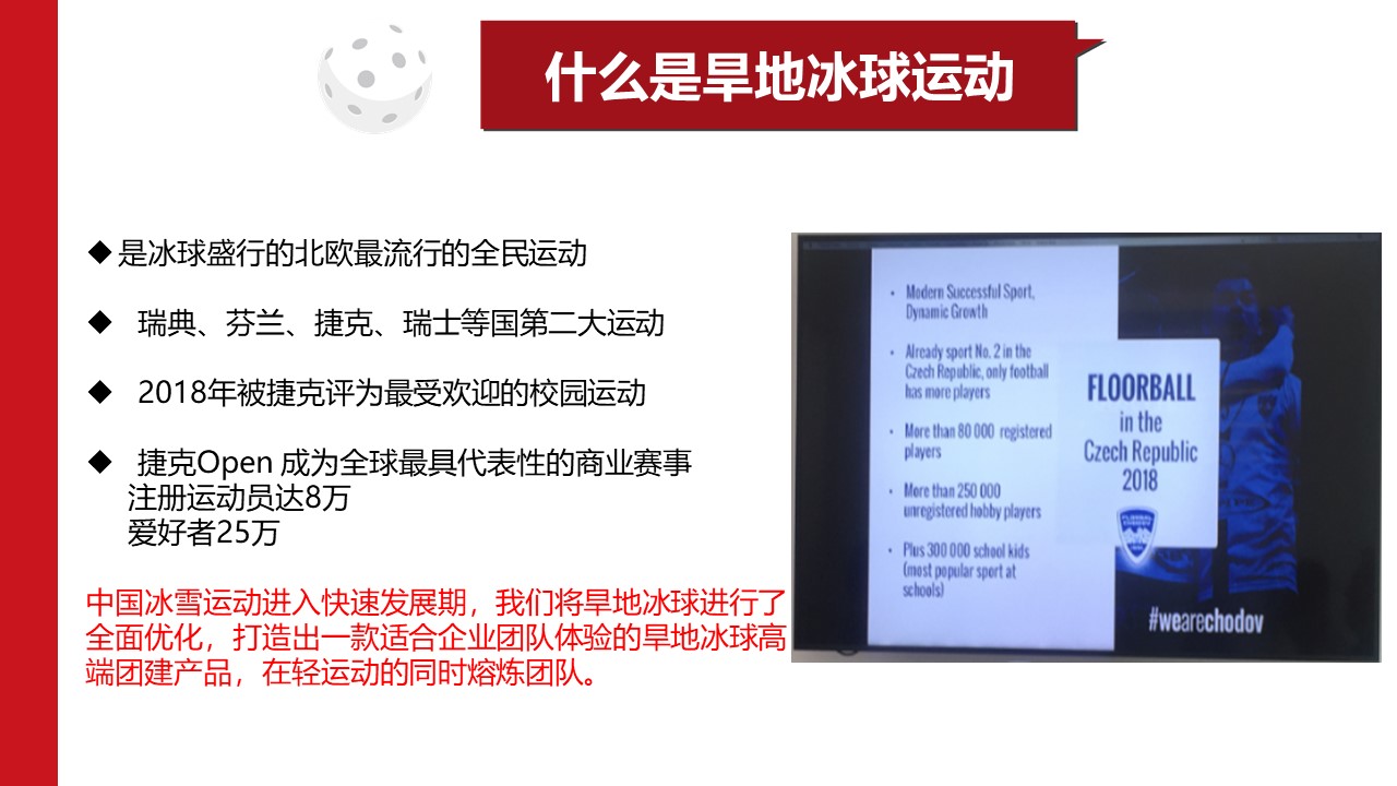 球索未來,用體育塑造人格,用競賽凝聚團隊;從無到有,從點到面的爆發,旱地冰球-最潮最酷最有料的團建。團隊的領袖特質從旱地冰球開始 是冰球盛行的北歐最流行的全民運動。瑞典、芬蘭、捷克、瑞士等國第二大運動,2018年被捷克評為最受歡迎的校園運動 捷克Open 成為全球最具代表性的商業賽事; 注冊運動員達8萬,愛好者25萬。中國冰雪運動進入快速發展期,我們將旱地冰球進行了全面優化,打造出一款適合企業團隊體驗的旱地冰球高端團建產品,在輕運動的同時熔煉團隊。