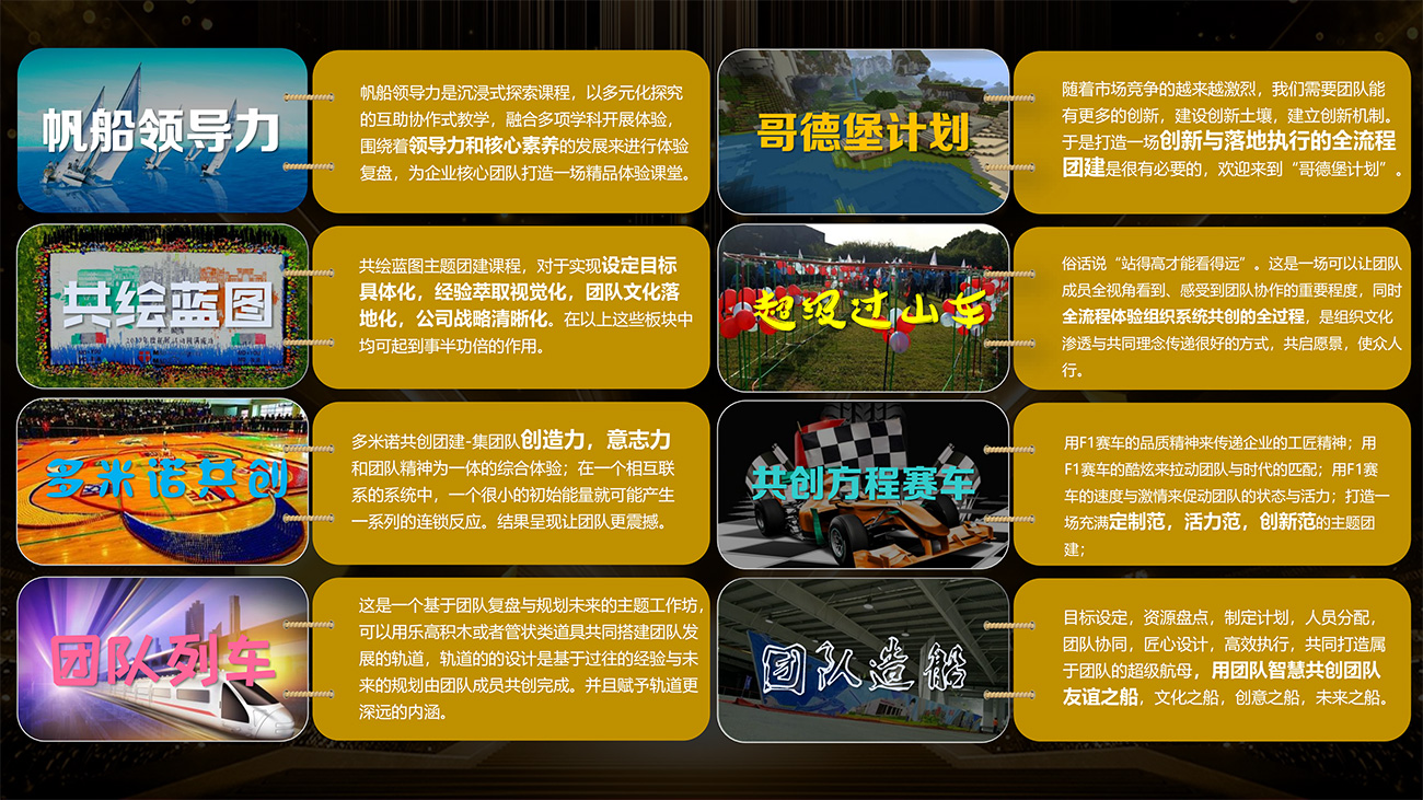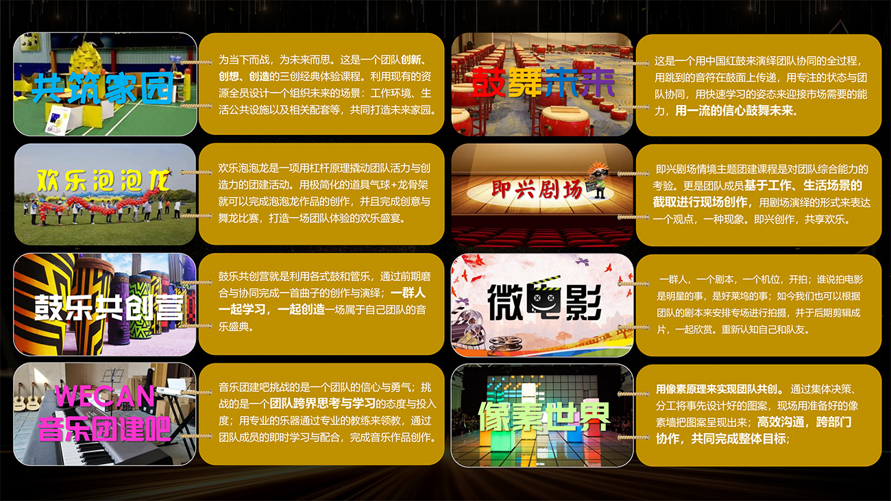 榮耀時刻多種特色主題的搭配組合,制勝于團隊的創(chuàng)意與規(guī)劃,決戰(zhàn)于團隊的協(xié)同與細節(jié),結果于團隊的執(zhí)行與管控,一起進入榮耀之旅,共同見證榮耀時刻。